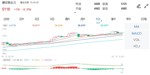 4月13日,国内商品期货多数上涨,动力煤、豆一、纸浆、铁矿涨幅居前,另螺纹钢昨日触及布林带中轨后迅速收复5000元、5100元关口。截止收盘,螺纹钢主力涨2。36%,报5116元。